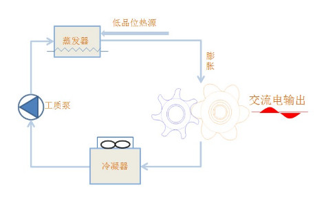 基于有機(jī)郎肯循環(huán)(Organic Rankine Cycle簡(jiǎn)稱ORC)原理,利用低品位熱源產(chǎn)生動(dòng)力:通過低沸點(diǎn)有機(jī)工質(zhì)獲取其他介質(zhì)的熱能,轉(zhuǎn)化為壓力能,通過膨脹機(jī)將壓力能轉(zhuǎn)化為機(jī)械能,最終通過發(fā)電機(jī)將機(jī)械能轉(zhuǎn)化為電能。